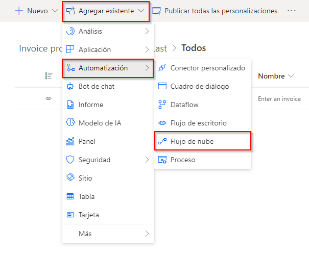 Tras hacer clic en la solución, seleccione el menú desplegable Agregar existente, en la parte superior de la página. Luego, seleccione Automatización y Flujo de nube.