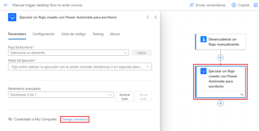 Tras configurar la conexión, siempre puede ver y seleccionar su conexión seleccionando la tarjeta de acción Ejecutar un flujo creado con Power Automate para escritorio y seleccionando Cambiar referencia de conexión.
