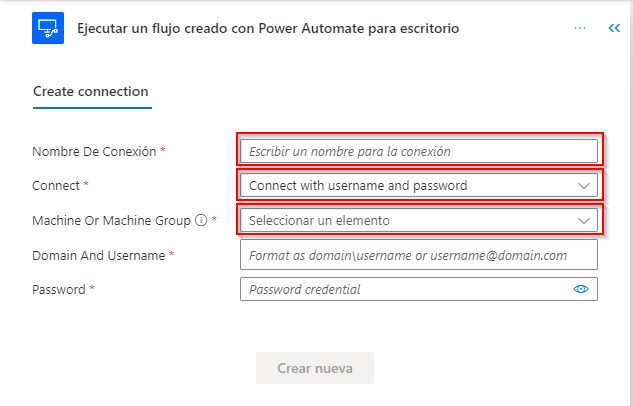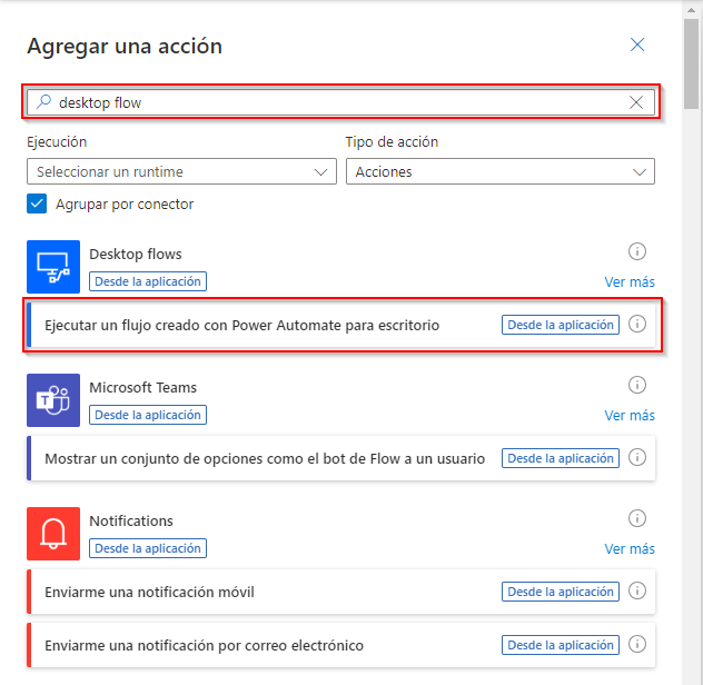 desktop flowen el cuadro de búsqueda y seleccione Ejecutar un flujo creado con Power Automate para escritorio, ubicado en Flujos de escritorio.En el cuadro Nombre de conexión, escriba