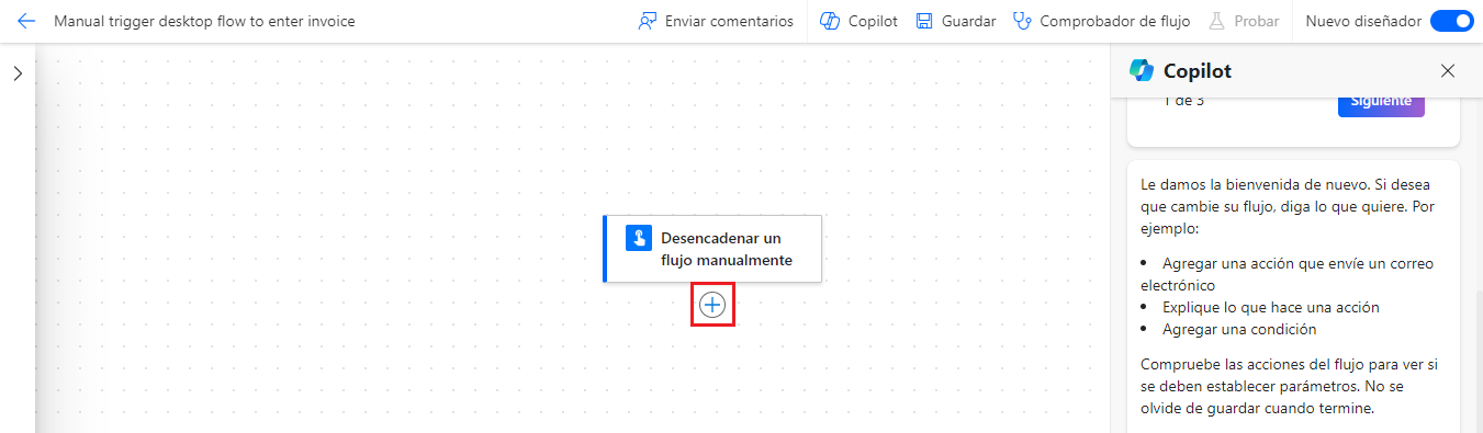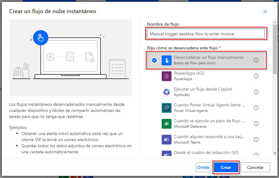 Manual trigger desktop flow to enter invoicey seleccione Desencadenar un flujo manualmente. Seleccione Crear.Agregue un paso seleccionando el icono +, bajo la tarjeta de acción Desencadenar un flujo manualmente.