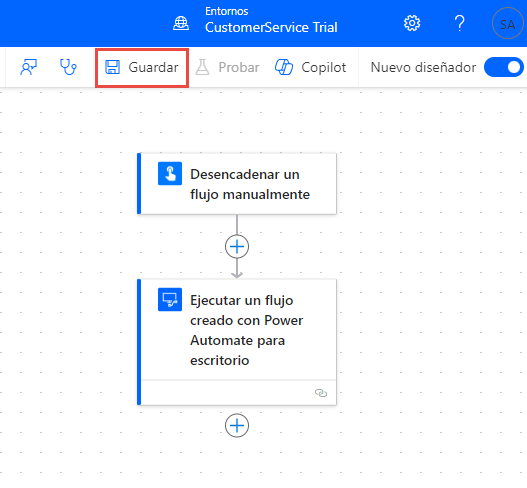 Seleccione Guardar, en la esquina superior derecha de la pantalla, y espere a que se guarde el flujo.