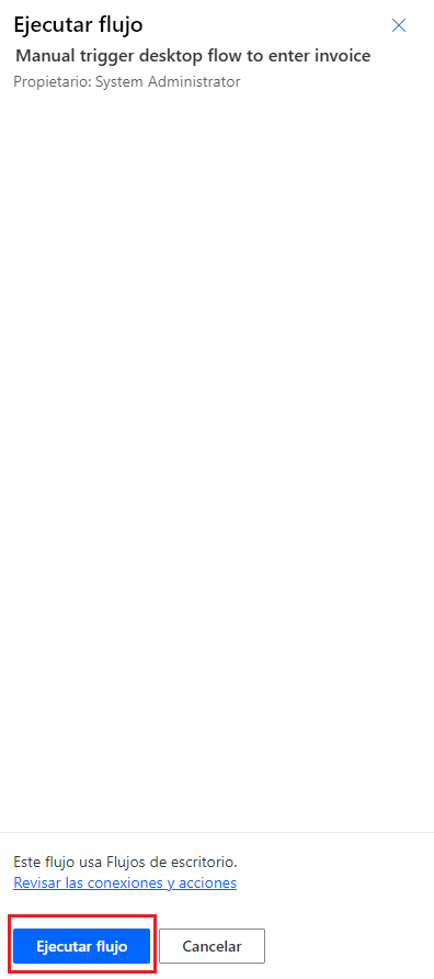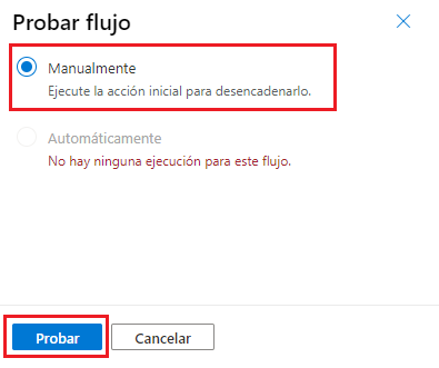 Desde el cuadro de diálogo Probar flujo, seleccione Manualmente y, a continuación, Probar.