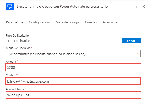 Rellene los cuadros Importe, Contacto y Nombrecuenta con los siguientes valores de entrada de ejemplo (utilizará valores de entrada estáticos por ahora y en los próximos laboratorios aprenderá a utilizar valores de entrada dinámicos):