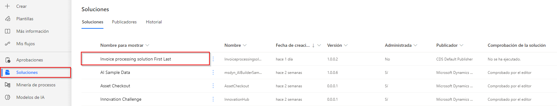 Seleccione Soluciones y seleccione Solución de procesamiento de facturas Nombre Apellido, creada anteriormente.