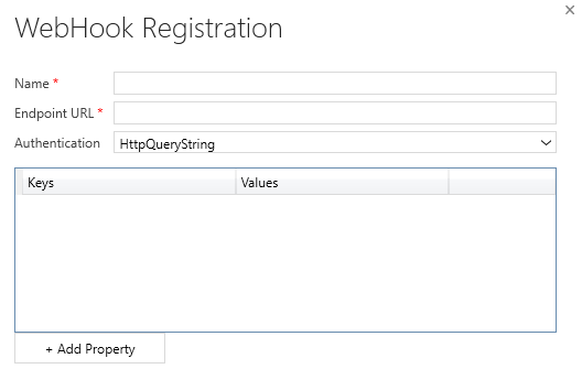 Aparece el siguiente cuadro de diálogo Registro de WebHook, donde puede configurar la URL del punto de conexión, junto con las opciones de autenticación.