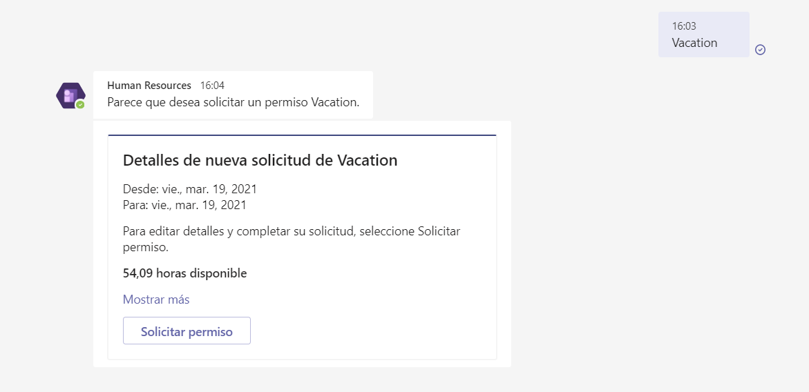 La aplicación Human Resources de Microsoft Teams permite que los empleados soliciten tiempo libre rápidamente y vean la información del saldo de permisos en Microsoft Teams. Los empleados pueden interactuar con un bot para solicitar información e iniciar una solicitud de permiso. También pueden enviar información a otras personas sobre el próximo permiso fuera de la aplicación Human Resources.