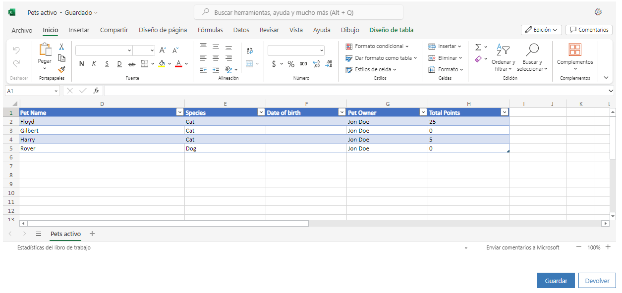 La característica Abrir en Excel Online en aplicaciones basadas en modelos muestra las filas y columnas de la vista de tabla actual, y le permite realizar ediciones rápidas, crear nuevas filas y guardar la información actualizada en Dataverse.