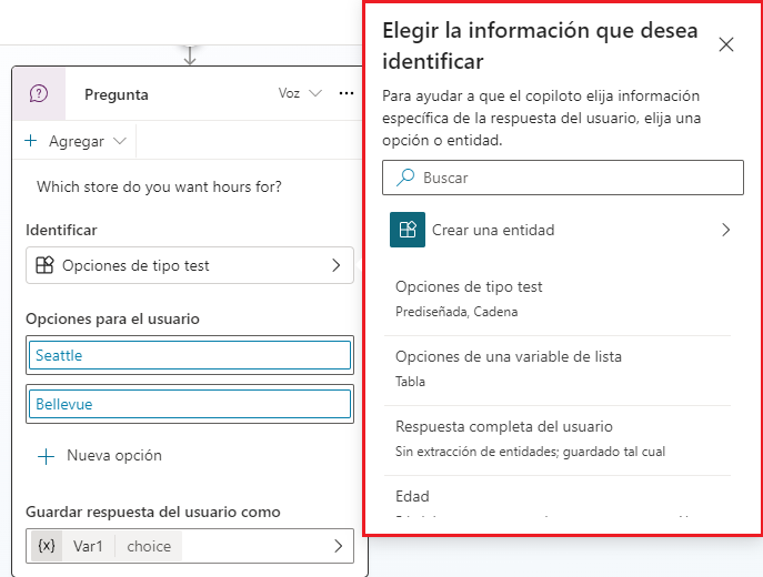 Una forma de hacerlo es a través de lo que se conoce como entidades. Una entidad puede verse como una unidad de información que representa un determinado tipo de tema del mundo real, como un número de teléfono, código postal, ciudad o el nombre de una persona. Por ejemplo, si se establece el campo Identificar en Ciudad, solo se extraería información sobre la ciudad de la respuesta del usuario. Si el usuario introdujo algo como Vivo en Seattle, entiende que Seattle es una ciudad. Si alguien introdujo Me encanta NYC, entiende que NYC es una abreviatura de New York City y almacenaría la respuesta de NYC. Hay varias opciones como este ejemplo, como Correo electrónico, Fecha y hora, Nombre de la persona y Número de teléfono, entre otras.