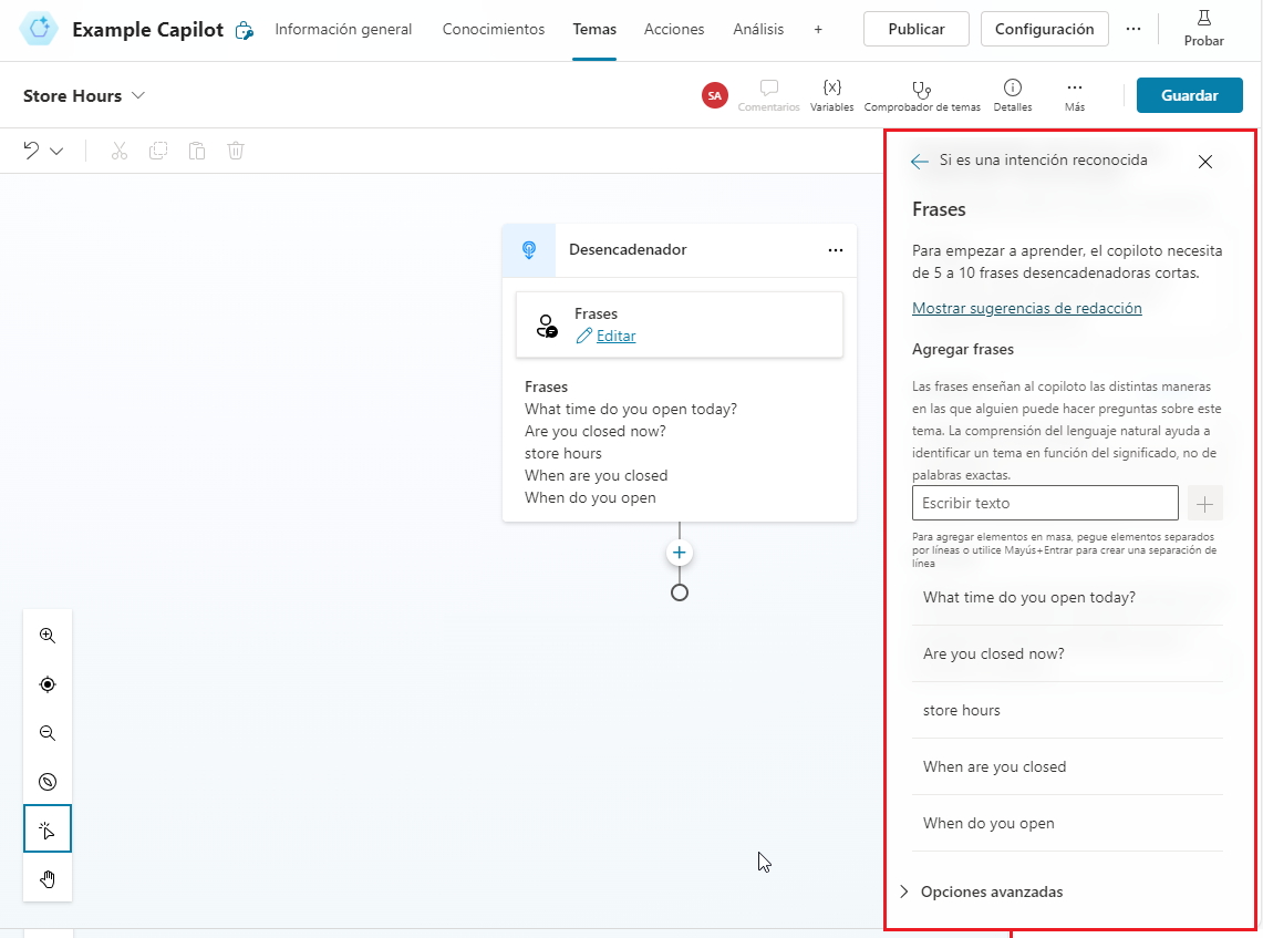 Lo primero que debe definir en un tema es las frases que el agente debe buscar para desencadenar el tema. Las frases desencadenadoras se agregan seleccionando Editar junto a Frases. Un solo tema puede tener definidas varias frases desencadenadoras. Tener de cinco a diez frases desencadenadoras es un buen punto de partida, pero puede agregar tantas como necesite. Se puede usar puntuación en las frases desencadenadoras. Sin embargo, es mejor utilizar frases cortas en lugar de frases largas. Trate de pensar en cómo podría expresar su solicitud un cliente. Si el tema se utiliza para comunicar el horario de la tienda, los desencadenadores deberían estar relacionados con la apertura o el cierre, los plazos, las fechas, etc. El uso de frases como "¿Cuales son sus horarios?", "¿Cuándo abre?", "Horario de atención" y "Horario de funcionamiento" serían buenas frases iniciales. Se pueden agregar más frases desencadenadoras con el tiempo, a medida que detecte otras que puedan ser necesarias.