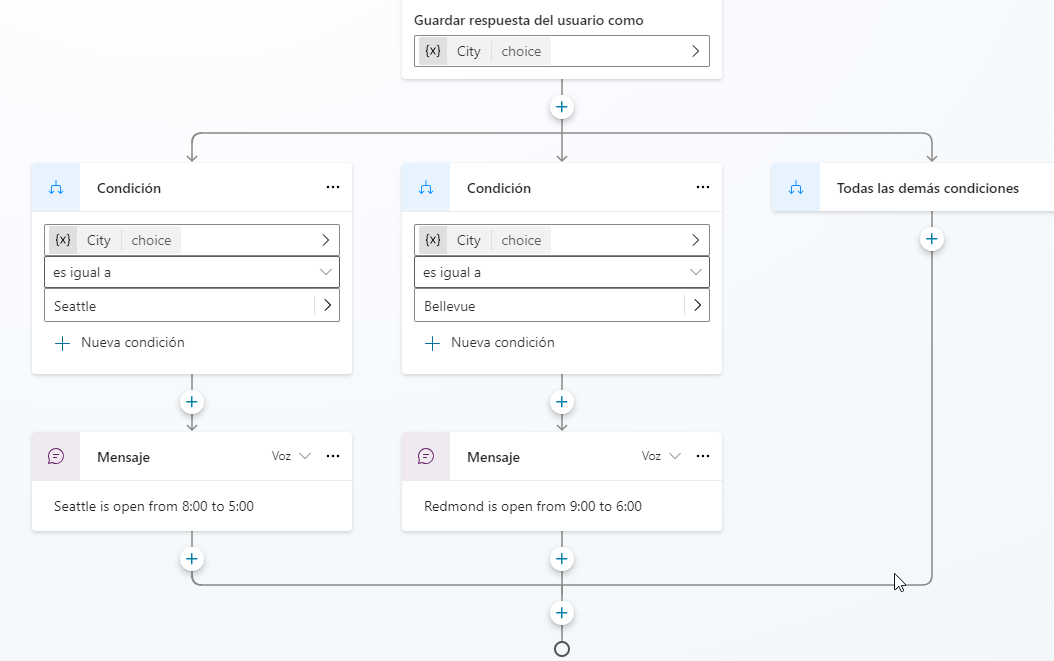 Agregar ramificaciones a un tema es lo que realmente hace que el tema pase de ser una ruta unidireccional a una conversación de múltiples capas. Las distintas ramificaciones y rutas garantizan que se proporcione al cliente datos y resoluciones basados en la situación en curso.