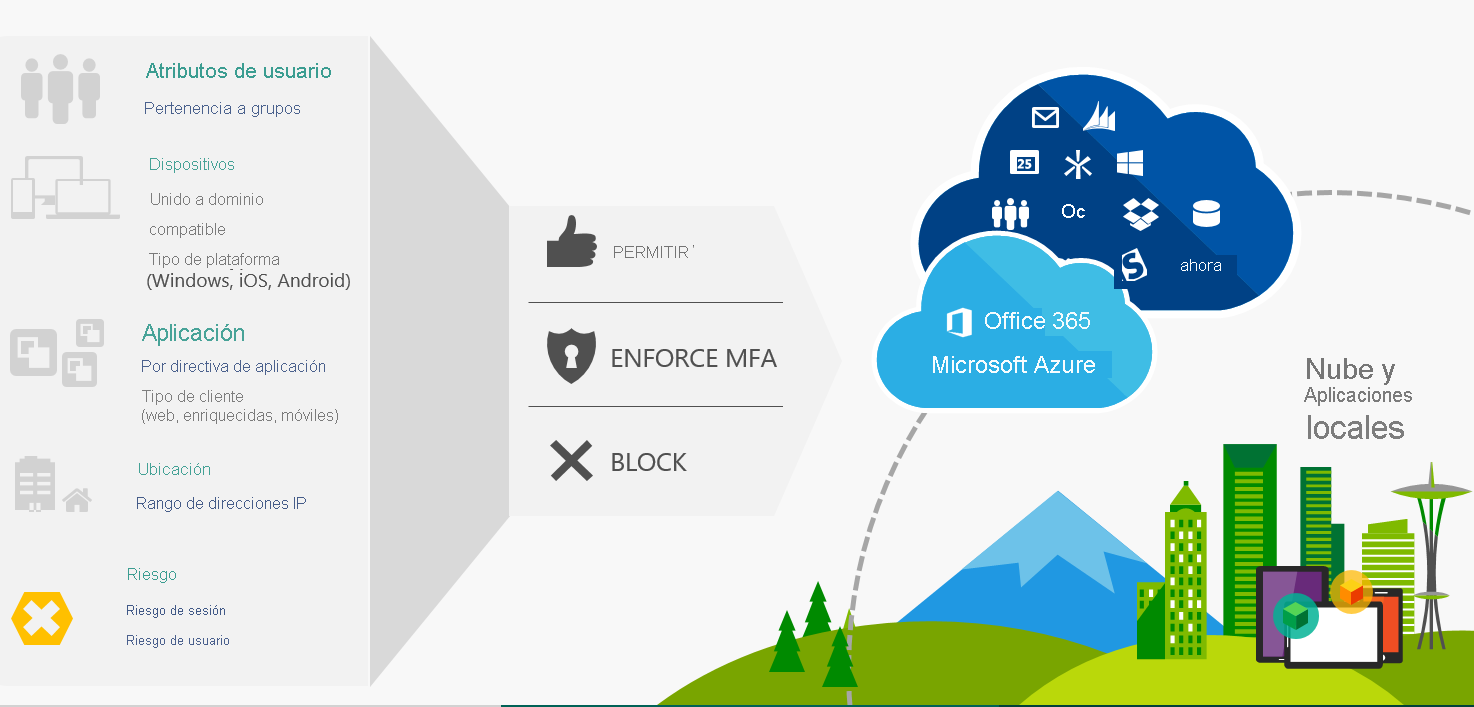 Por ejemplo, el acceso condicional permite controlar los dispositivos y las aplicaciones que pueden conectarse al correo electrónico. El acceso condicional proporciona un control de acceso pormenorizado para mantener los datos corporativos seguros a la vez que proporciona a los usuarios finales una experiencia que les permite realizar su mejor trabajo desde cualquier dispositivo. De hecho, puede definir condiciones que permiten el acceso a los datos corporativos en función de la ubicación, el dispositivo, el estado del usuario y la confidencialidad de la aplicación.