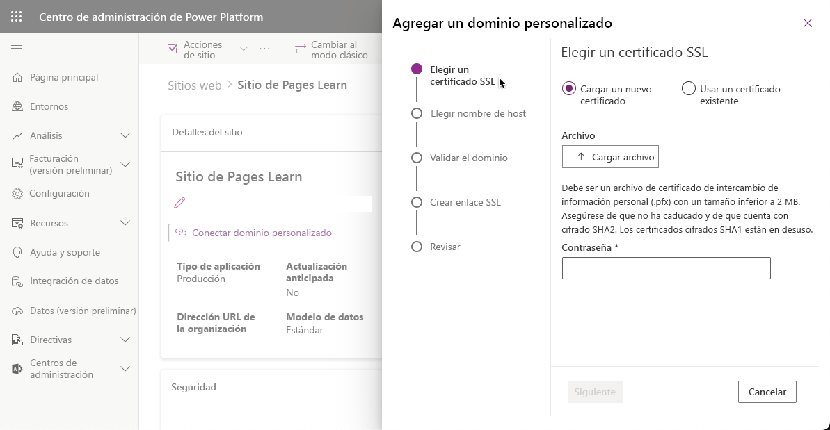 - La organización debe contar un certificado SSL válido para el dominio. El certificado SSL debe tener el formato PFX, firmado por una autoridad de certificación de confianza, y cumplir muchos otros requisitos de seguridad (consulte Agregar un nombre de dominio personalizado para ver una la lista completa de los requisitos de certificado).