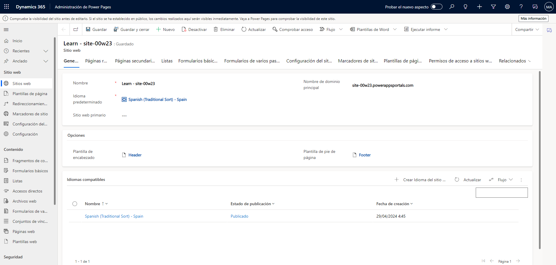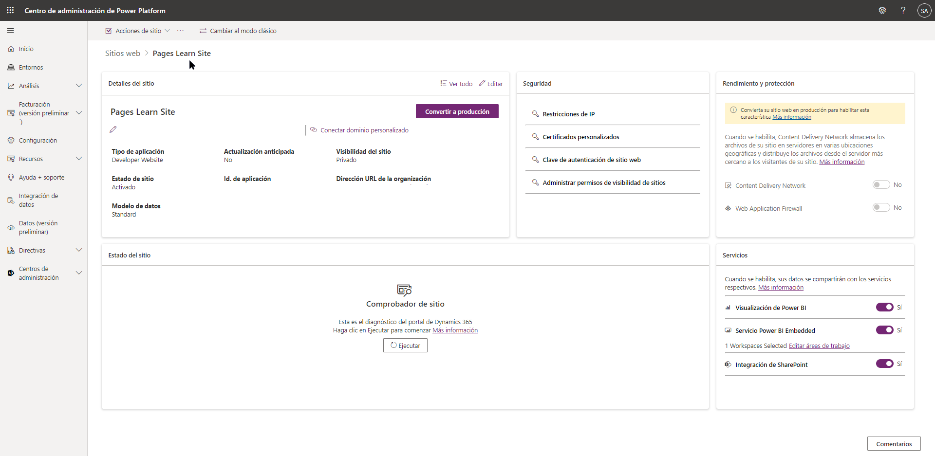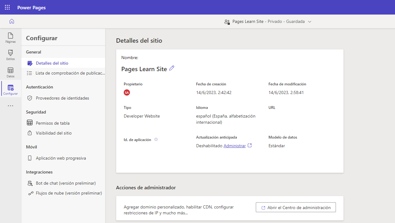 Para obtener más información, consulte Información general sobre la aplicación Power Pages Management.