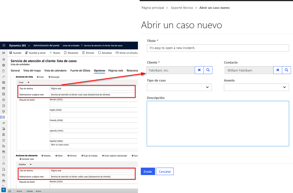 Formularios: permite a los usuarios crear un nuevo caso o editar uno existente. Estos formularios usan formularios basados en modelos que se definen en un entorno de Dataverse con la aplicación Dynamics 365 Customer Service.