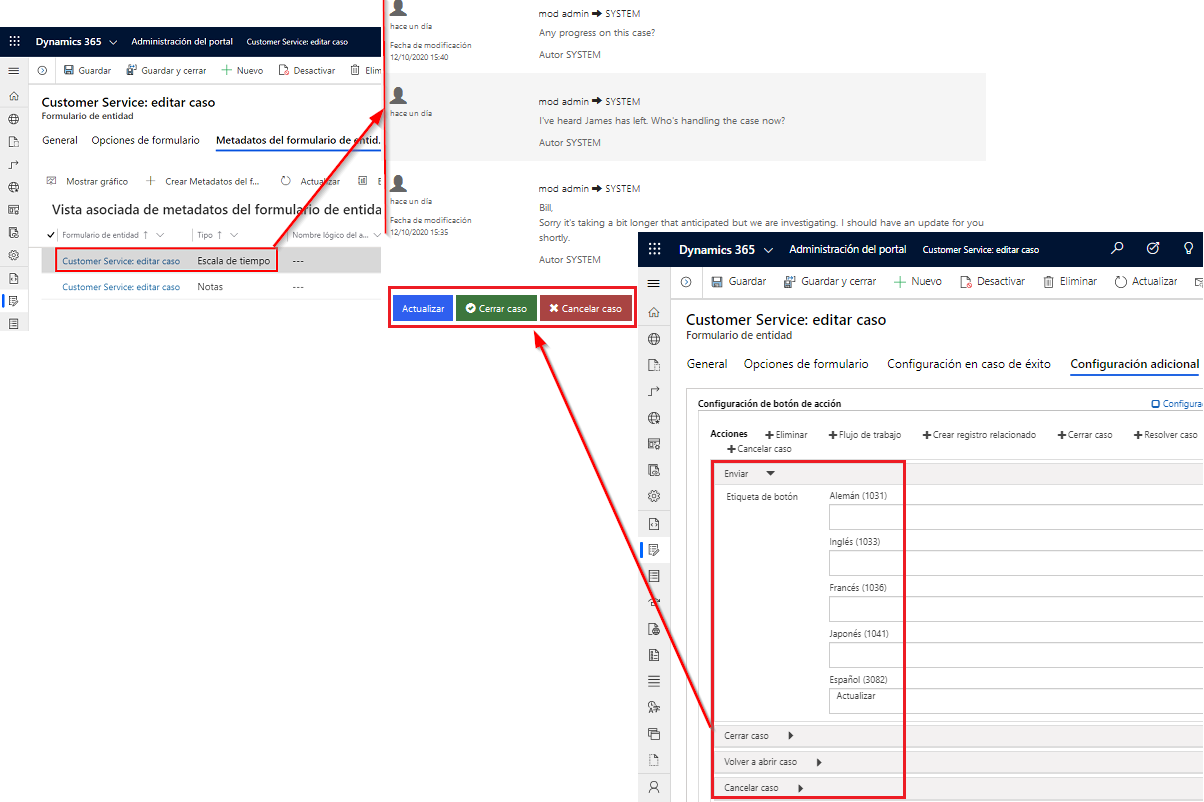 Metadatos de formulario: el formulario Editar caso contiene metadatos que ayudan a refinar la visualización de algunas columnas y habilitar los comentarios de la subcuadrícula Escala de tiempo. La lista incluye acciones específicas de casos, como Cerrar caso.