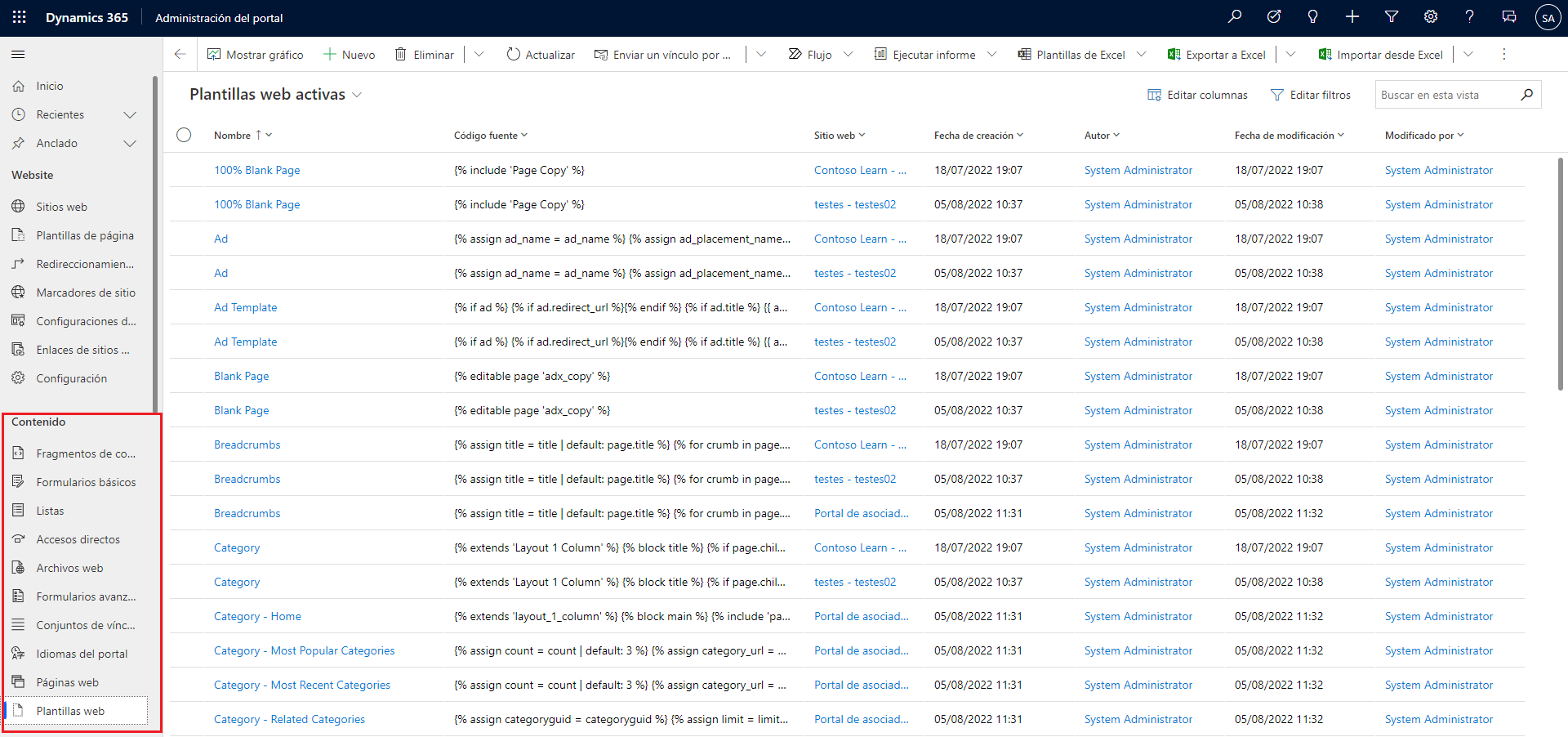 La sección Contenido contiene las tablas que definen qué información estática y dinámica se muestra en un sitio web de Power Pages y cómo se muestra. Si bien puede agregar parte del contenido mediante estudio de diseño de Power Pages, solo puede agregar o modificar determinados aspectos actualizando los datos directamente con la aplicación Administración del portal.