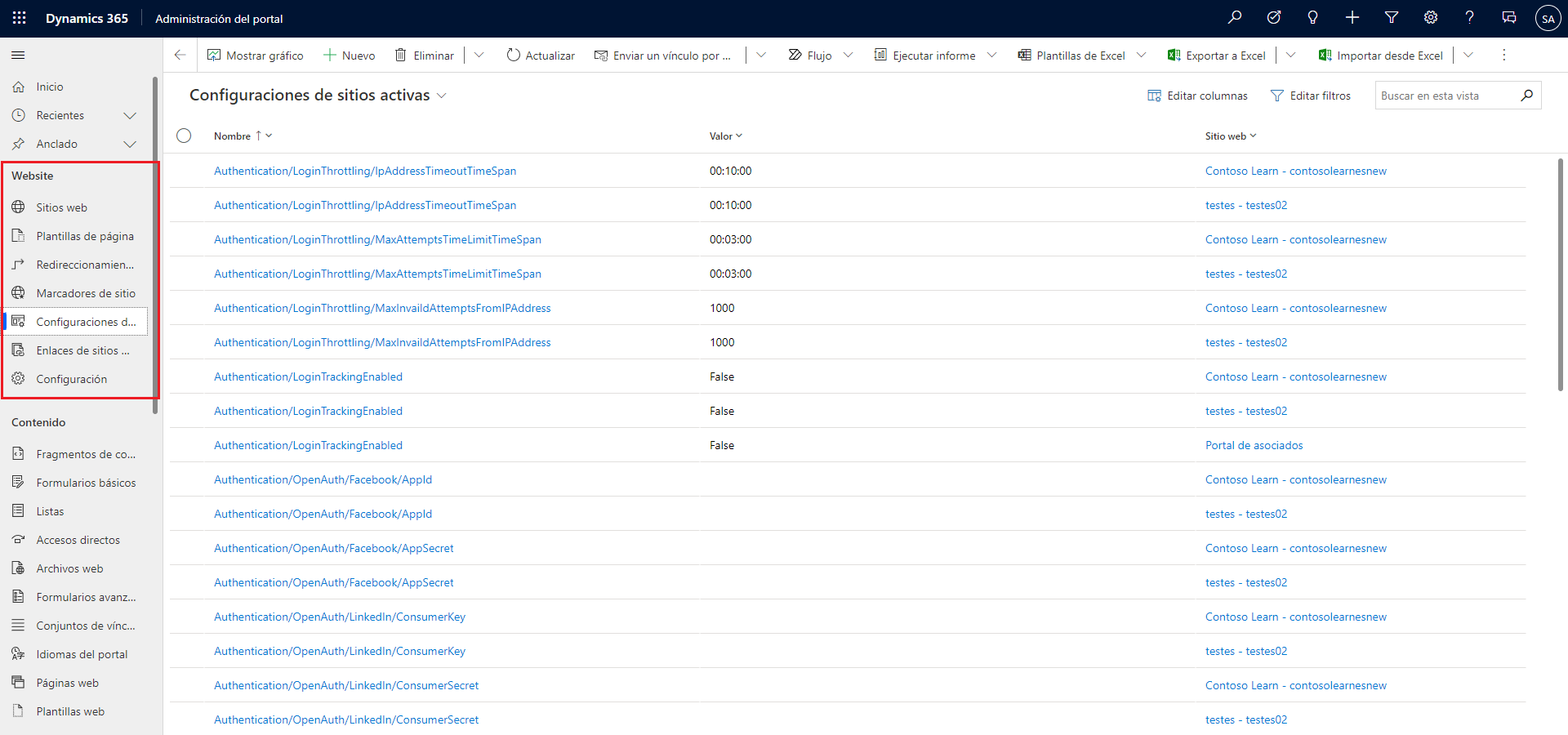 | Configuración del sitio | La configuración del sitio define comportamientos específicos de la funcionalidad y las características del sitio web. La configuración del sitio está constituida por pares de valores que pueden habilitar o deshabilitar elementos determinados, como la configuración de autenticación, la búsqueda o el almacenamiento en caché. |