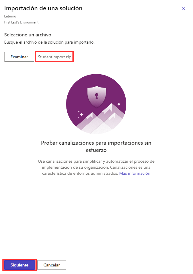 Seleccione el botón Examinar y busque la ubicación donde ha descargado la solución. La ruta del archivo es 1. Dev Resources...>StudentImport.zip. Seleccione StudentImport.zip y, cuando el nombre del archivo aparezca junto al botón Examinar, seleccione Siguiente.