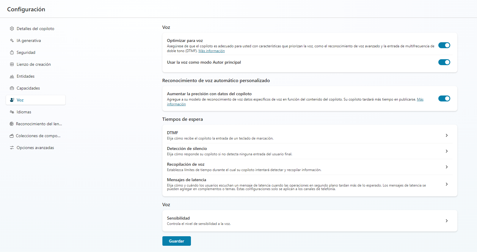 Debe configurar algunos valores para instalar las capacidades del agente para voz. Se puede acceder a toda la configuración de voz yendo a Configuración>Voz. Al principio, el agente no está optimizado para voz. Al seleccionar Optimizar para voz, pasarán a estar disponibles capacidades de voz adicionales.