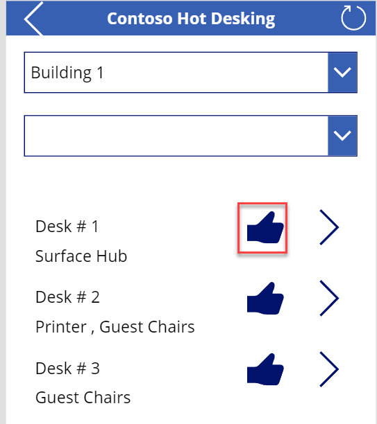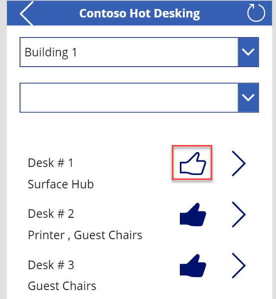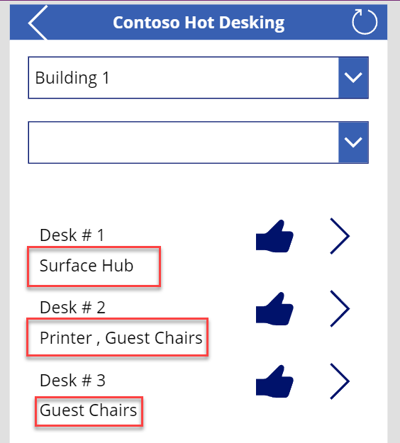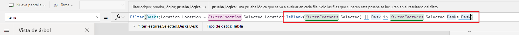 Filter(Desks,Location.Location = FilterLocation.Selected.Location,IsBlank(filterFeatures.Selected) || Desk in filterFeatures.Selected.Desks.Desk)Guarde los cambios (si es necesario).