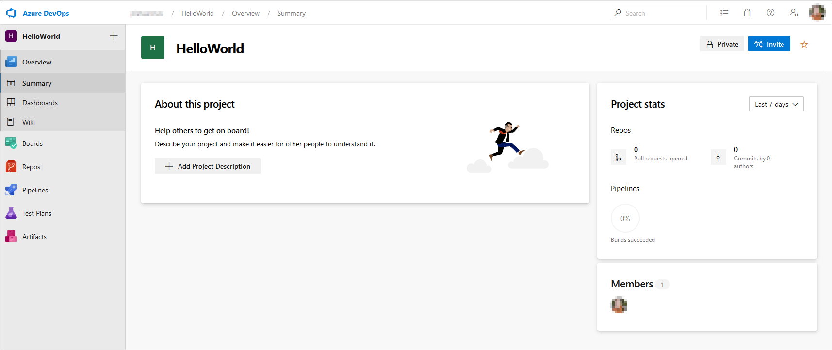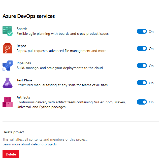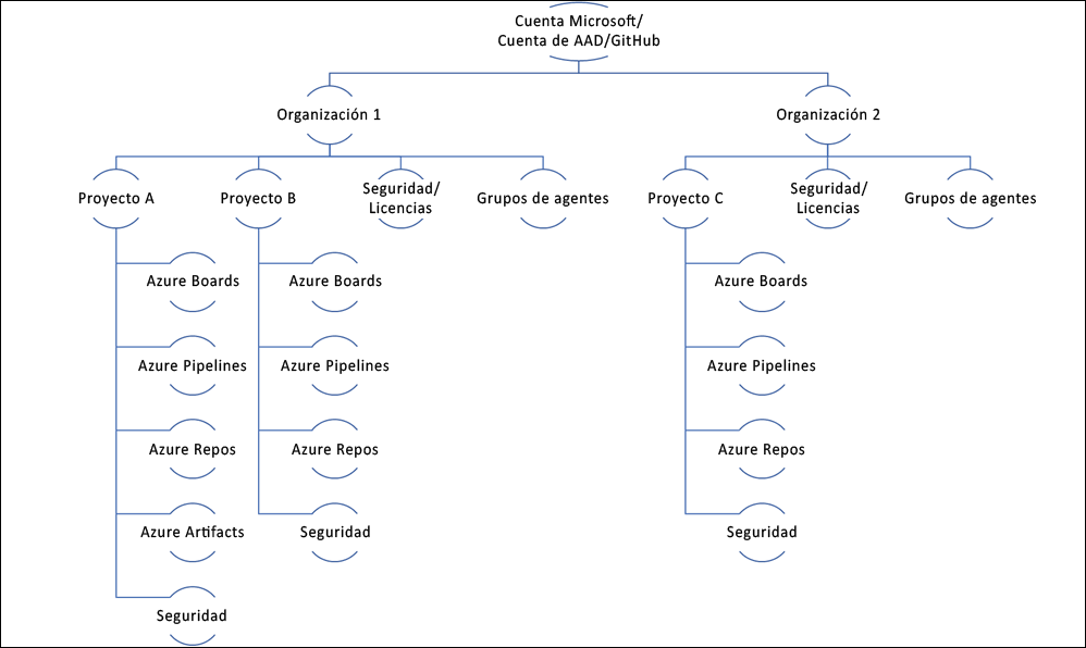 Cada organización contiene varios proyectos. Un proyecto en sí mismo es un grupo de diversos servicios de Azure DevOps. Puede encontrar los servicios de Azure Boards, Repos, Pipelines, Artifacts y Test Plans en cada uno de los diferentes proyectos. Si bien primero debe configurar la seguridad y los diferentes usuarios permitidos a nivel organizativo, puede configurar aún más la seguridad en el nivel de proyecto. Puede crear un proyecto por cliente para poder agrupar todo para un cliente específico en un contenedor lógico.