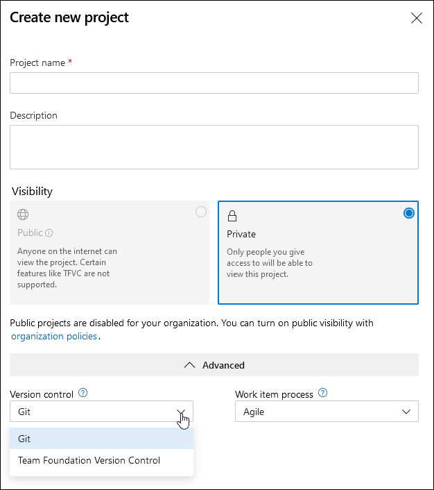 Crear un nuevo proyecto es fácil si se hace clic en el botón azul Nuevo proyecto de la ventana de inicio. Especifique un nombre para su proyecto, marque si el proyecto es privado o público, y seleccione su sistema Control de la versión preferido y una plantilla de Proceso de elemento de trabajo.
