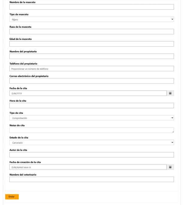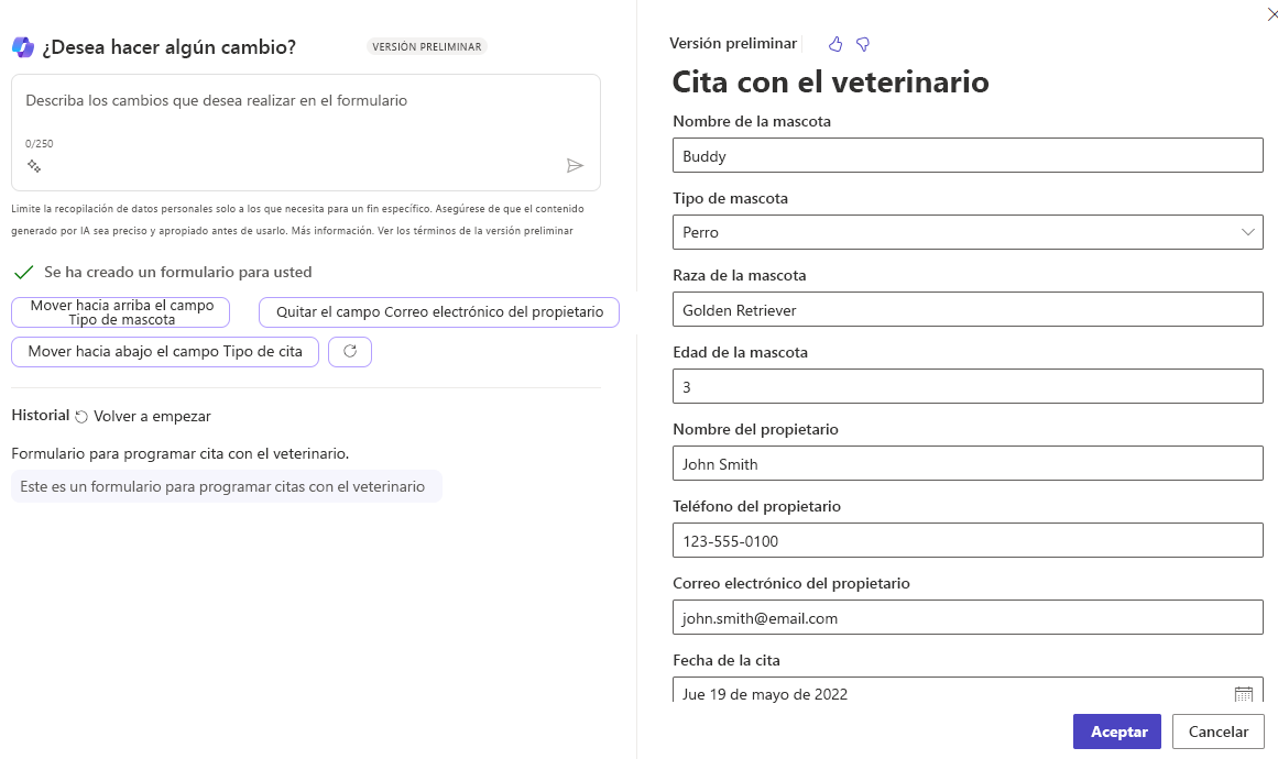 Puede utilizar Copilot para agregar formularios a sus páginas. Por ejemplo, si desea que Copilot cree un formulario para programar una cita veterinaria, debe describir el formulario que desea con algo como "Formulario para programar una cita veterinaria" en la solicitud. Copilot crea el formulario y muestra una vista previa para que usted pueda revisarla y realizar cambios si es necesario. En la vista previa, puede cancelar y empezar de nuevo si no le gusta el formulario ofrecido por Copilot. También puede ajustar el formulario pidiéndole a Copilot que agregue una columna o elimine columnas no deseadas.