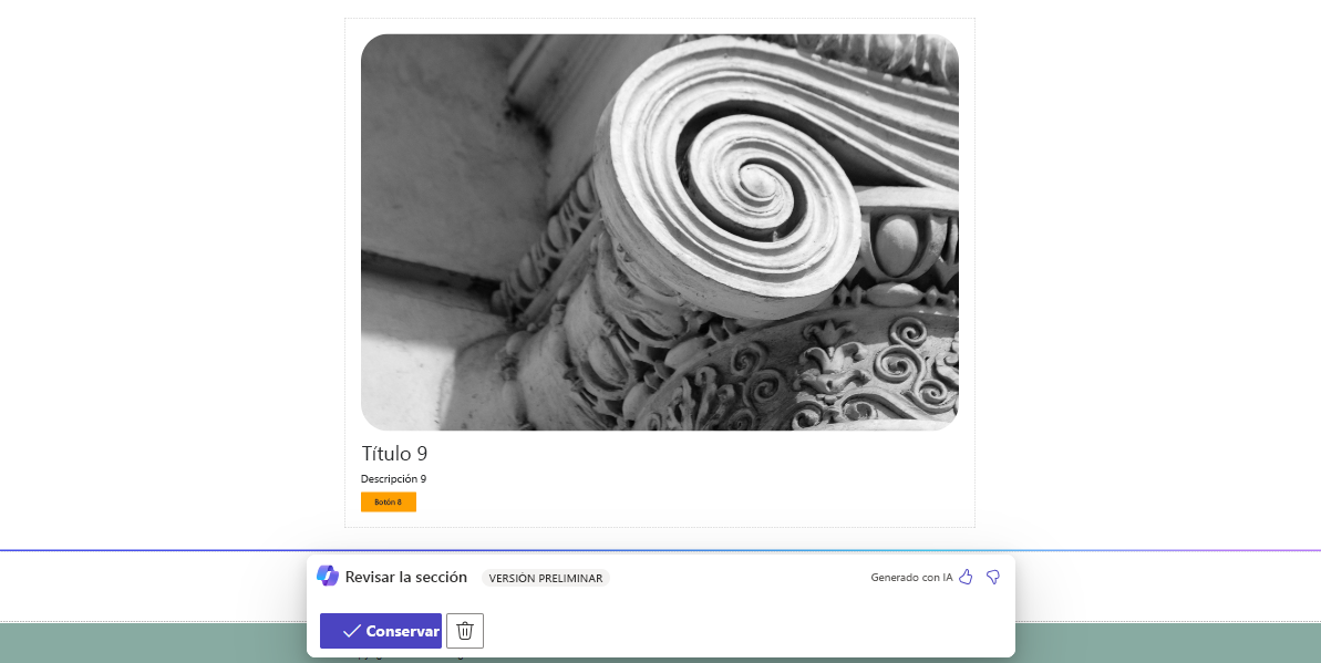 Puede usar Copilot para agregar páginas o secciones a su página. Por ejemplo, si desea agregar una sección que tenga imágenes, un título y una descripción, puede describírsela a Copilot escribiendo algo como "Agrega una sección con una imagen, un título y una descripción" en la solicitud. Luego, Copilot agrega la sección a su página y le proporciona una vista previa, donde puede elegir aceptarla o eliminarla. Tras conservar los cambios que realiza Copilot, seguirá teniendo la opción de deshacerlos.