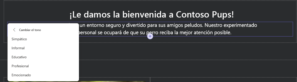 Cuando selecciona el tono que desea, Copilot genera opciones entre las que puede elegir. Si una opción parece la mejor, puede seleccionarla. Esta opción reemplaza automáticamente el texto del sitio anterior. El texto sigue siendo editable. Por lo tanto, si encuentra una opción que se acerca mucho a lo que está buscando, puede seleccionarla y editarla para hacer los cambios finales. La siguiente imagen es un ejemplo de las opciones de cuadro de diálogo y texto.