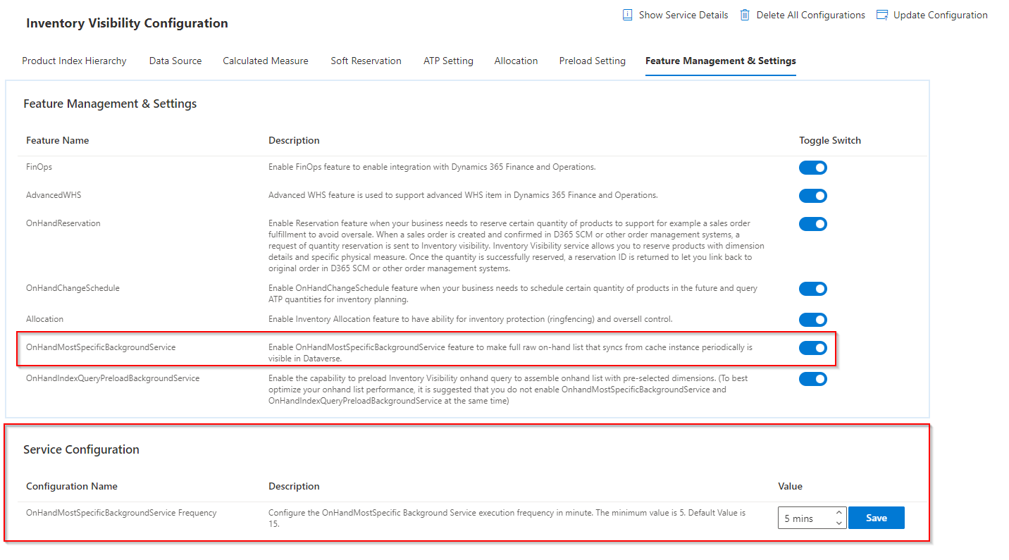 Cuando abra la aplicación visibilidad de inventario, la pestaña Resumen de inventario aparecerá a la izquierda. Esta página proporciona un resumen de inventario de productos, junto con todas las dimensiones. Para habilitar la página Resumen de inventario y establecer la frecuencia de sincronización, vuelva a la página Configuración y vaya a la pestaña Administración de características y Configuración. Luego, ponga la alternancia OnHandMostSpecificBackgroundService en Sí. Después de configurar la alternancia, la sección Configuración del servicio estará disponible. Luego, puede establecer el valor de frecuencia del servicio en segundo plano para la función. Tras hacer los cambios, seleccione el botón Actualizar configuración en la esquina superior derecha de la pantalla para confirmar los cambios.