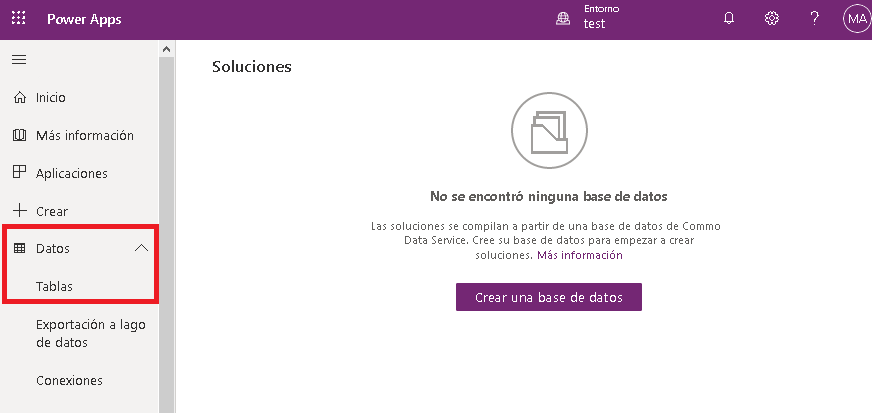 Algunos entornos no tienen bases de datos. Si no tiene estos productos en su inquilino, no tiene acceso a Dataverse. Para comprobar si existe un conjunto de datos o no, expanda Datos en el menú y seleccione Entidades. Es probable que reciba un mensaje que indique que no se encontraron soluciones. El botón Crear un nuevo entorno está disponible.