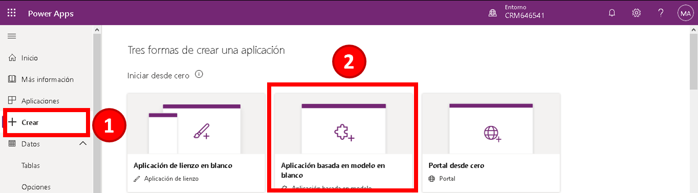 Para ejecutar un diseñador de aplicaciones y ver su aspecto, seleccione Crear y luego seleccione el icono Aplicación basada en modelo en blanco.