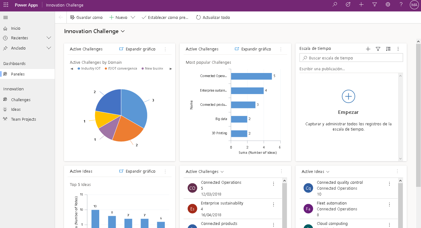 La mejor manera de comprender el concepto básico de la interfaz de usuario en las aplicaciones basadas en modelo es ejecutar una aplicación de ejemplo. También descubrirá los conceptos de las aplicaciones basadas en modelo que se pueden aplicar al desarrollar sus propias aplicaciones. Para ejecutar una aplicación de ejemplo, desplácese hasta la parte inferior de la pantalla desde su página de inicio en Power Apps y seleccione una de las aplicaciones cuyo Tipo se base en modelo.