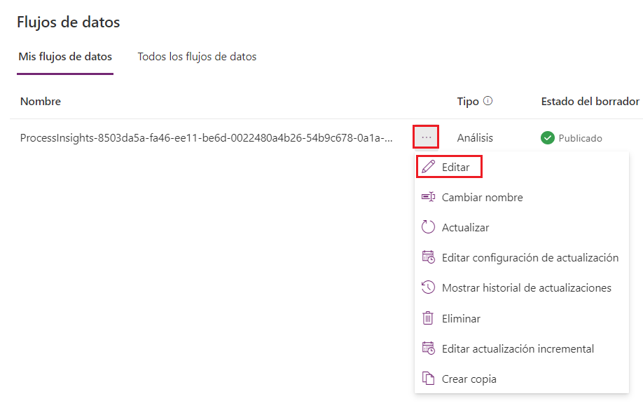 Para acceder a Power Query para un flujo de datos existente, puede seleccionar Editar desde los puntos suspensivos (Más comandos) relacionados con ese flujo de datos.