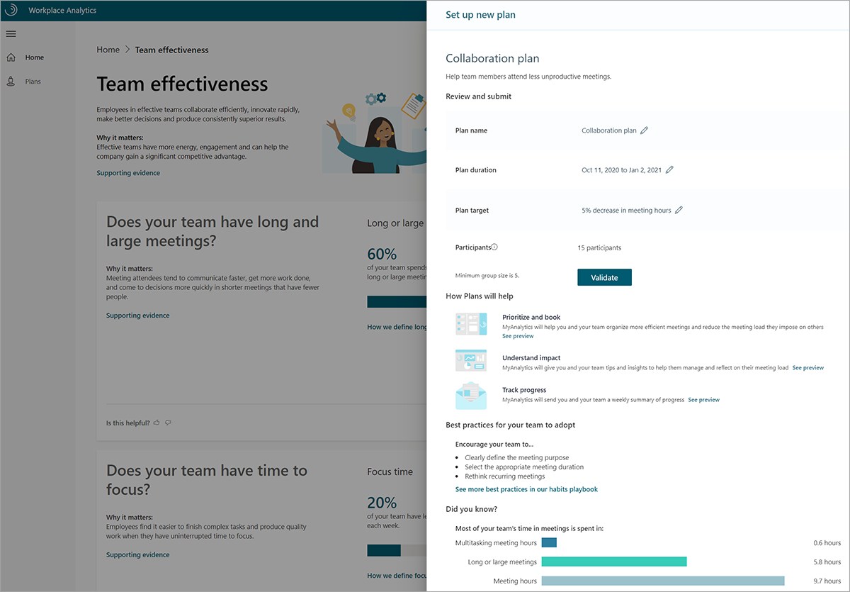 Puede usar la característica Planes de Workplace Analytics para crear planes de mejora para los empleados, con el objetivo de cambiar sus hábitos de trabajo para un mejor rendimiento. Con la característica Planes, puede: