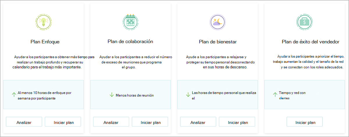 Habilitar planes: los analistas, analistas limitados y administradores de programas pueden crear un plan a través de Planes con Workplace Analytics en Viva Insights.