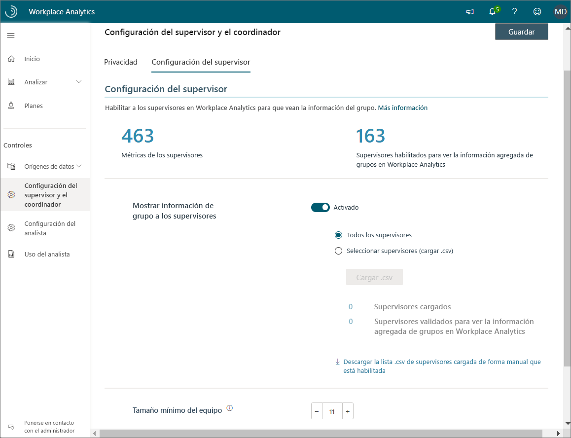 Los administradores y los responsables de equipo no pueden acceder a los datos individuales de los empleados. Los administradores a los que se les asigna el acceso solo pueden ver los datos del equipo en una vista de agregado. El umbral de tamaño de grupo predeterminado es de diez, incluido el administrador.