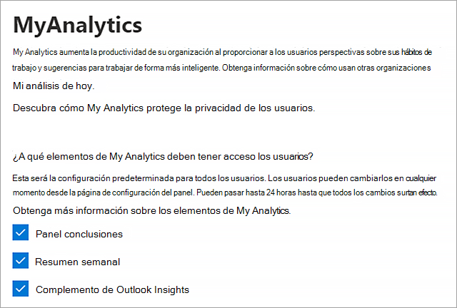 Habilitar Viva Insights: como administrador de Microsoft 365 puede iniciar sesión en el Centro de administración, seleccionar el plan de servicio MyAnalytics en Configuración> Servicio de configuración > dela organizacióny, a continuación, habilitar los elementos de Viva Insights y MyAnalytics.