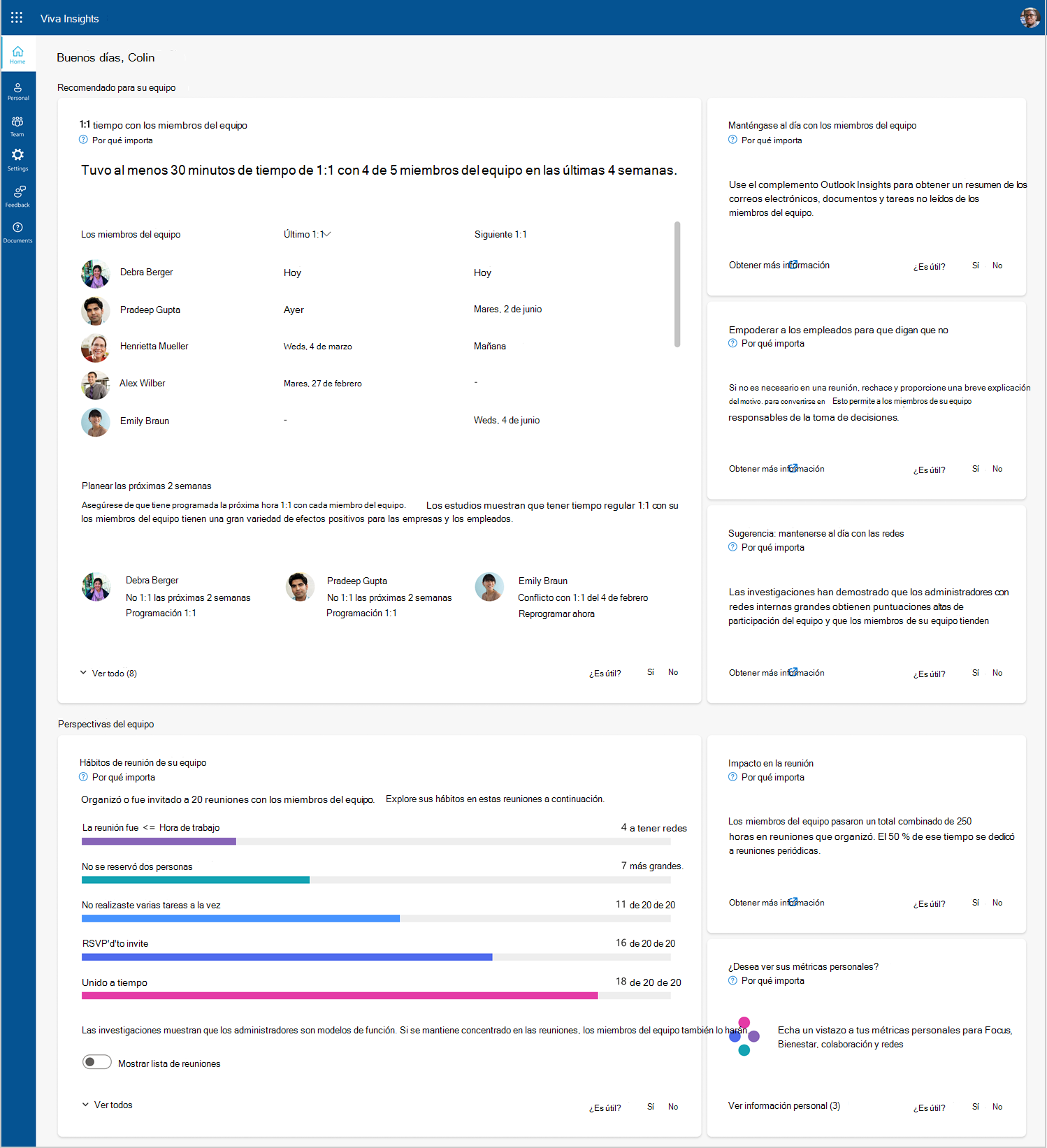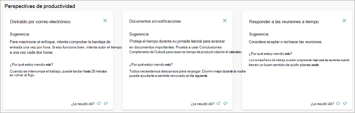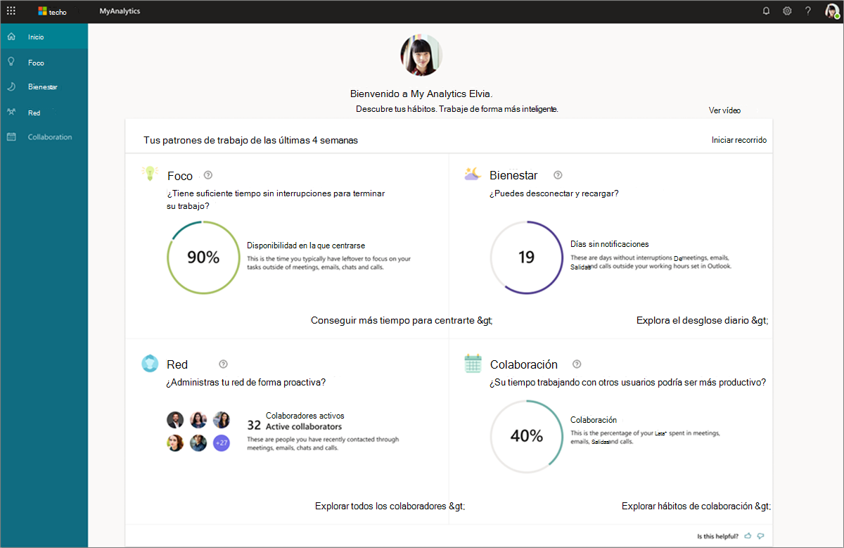 - Colaboración: obtenga sugerencias sobre cómo planificar su calendario, dedicar menos tiempo a reuniones de baja calidad y redactar correos electrónicos más eficaces.