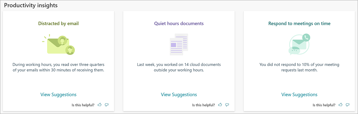 Después de abrir el complemento Viva Insights, verá varias tarjetas en el panel de Viva Insights.