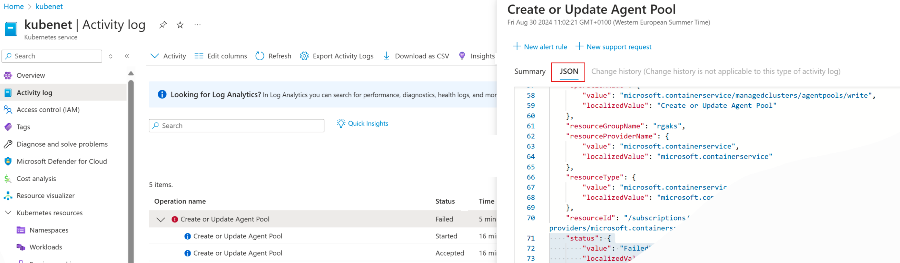 Seleccione una de las suboperaciones con errores para investigarla aún más. Seleccione las pestañas Resumen, JSON y Historial de cambios para solucionar el problema. La pestaña JSON contiene el texto de salida del error en formato JSON y normalmente proporciona la información más útil.