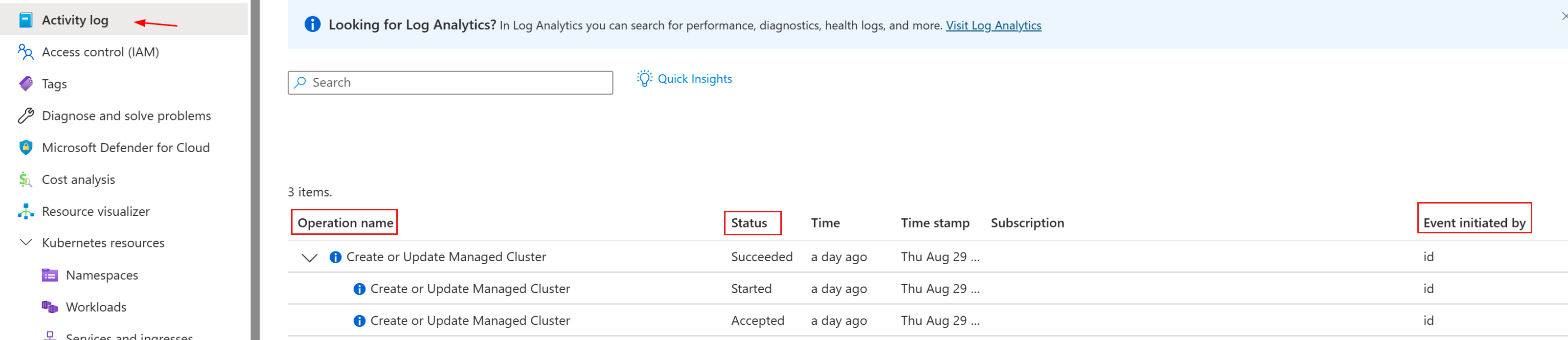 En la página Registro de actividad, busque entradas de registro en las que la columna Nombre de la operación muestra Crear o actualizar clúster administrado.