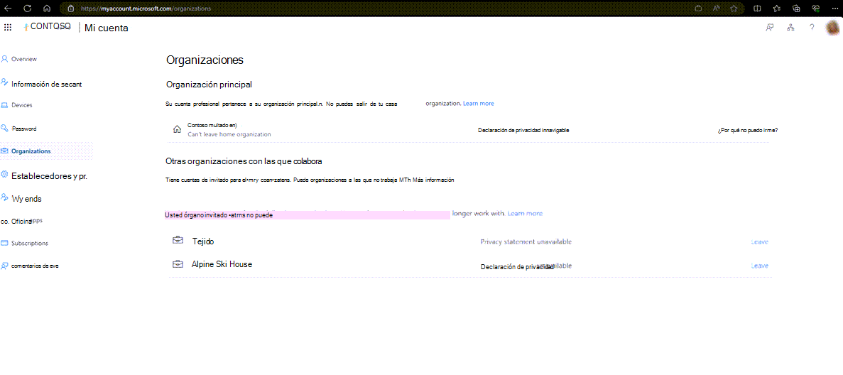 En Organizaciones > Otras organizaciones con las que colabora, consulte la lista de organizaciones a las que tiene acceso de invitado.