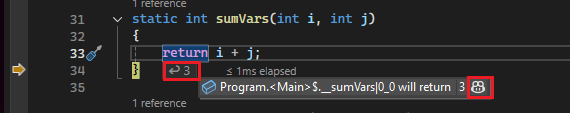 A partir de la versión 17.12 de Visual Studio 2022, puede ver los valores devueltos de las llamadas de método en línea y no solo en la ventana Autos.