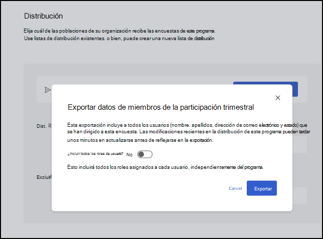 Después de completar la configuración del programa para una encuesta de Microsoft Viva Glint, configure la sección Distribución. Elija qué empleados son aptos para una encuesta; para ello, seleccione Distribución Listas o Roles de usuario para incluir y excluir.