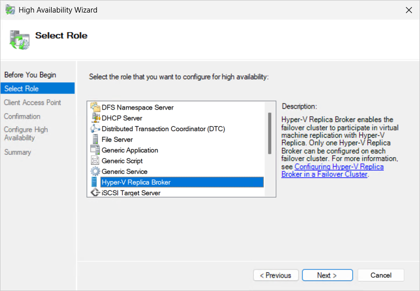 En el panel Acciones de la derecha, seleccione Configurar rol. En el Asistente para alta disponibilidad, si ve Antes de comenzar, seleccione Siguiente.