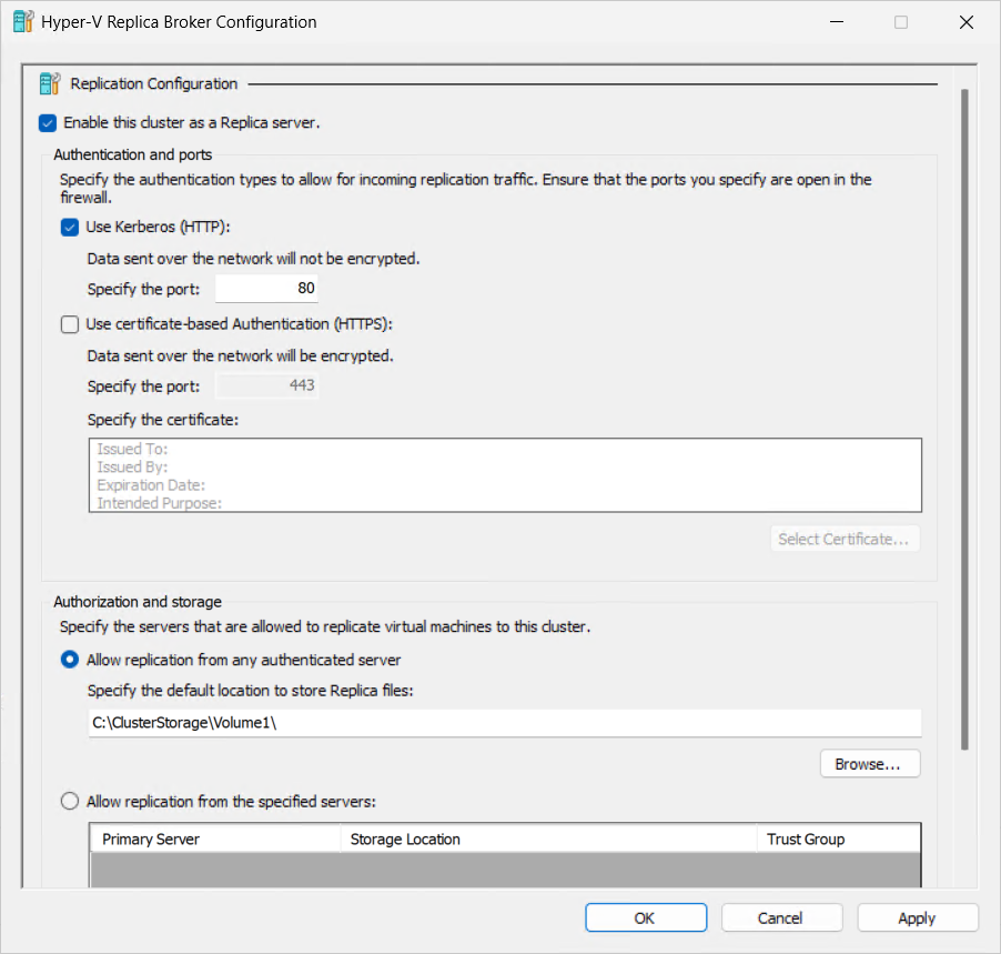 En Autorización y almacenamiento, seleccione Permitir la replicación desde cualquier servidor autenticado para permitir que el servidor de réplica acepte el tráfico de replicación de máquinas virtuales desde cualquier servidor principal que se autentique correctamente o Permitir que la replicación de los servidores especificados acepte el tráfico solo desde los servidores principales que seleccione específicamente. Para ambas opciones, debe especificar dónde deben almacenarse los VHD replicados en el clúster de Hyper-V réplica. Para un clúster, todos los nodos del clúster deben tener acceso a esta ubicación, como un volumen compartido de clúster (CSV) en
