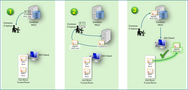 Para habilitar la entrega HTTPS, los administradores deben generar una solicitud de firma de certificado (CSR) desde la máquina host, firmarla mediante una entidad de certificación (CA) de confianza e importar el certificado firmado de nuevo a la máquina host. En las páginas siguientes, hay instrucciones de configuración guiada y scripts para entornos Windows y Linux para simplificar este proceso.