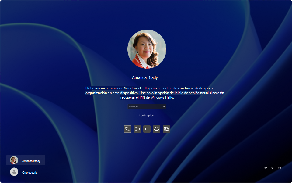 - Si un usuario intenta iniciar sesión sin Windows Hello, aparece un mensaje en la pantalla de inicio de sesión que indica que para acceder al contenido cifrado, el usuario debe iniciar sesión con Windows Hello