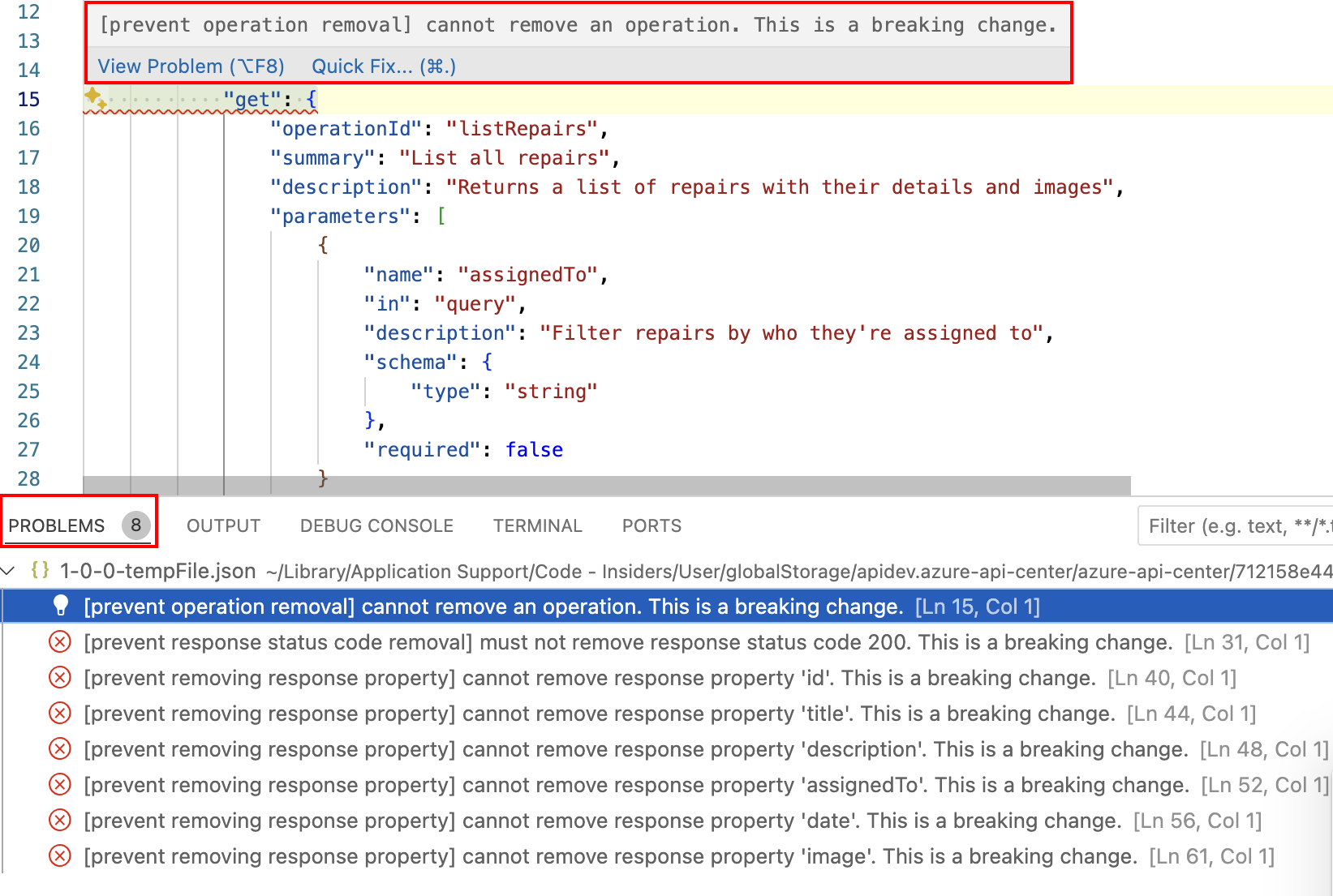 Visual Studio Code abre una vista de diferencias entre las dos especificaciones de API. Los cambios importantes se muestran en línea en el editor y, en la ventana Problemas (Ver>Problemas o Ctrl+Mayús+M).